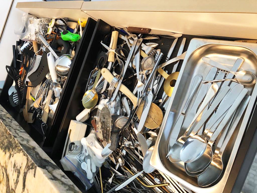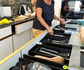 "Danielle viel meteen met de deur in huis. “Mag ik mijn gang gaan,” zei ze? “Mag ik alle indelingen in de lades en trekkasten installeren, en al je keukenspullen zo slim mogelijk in de lades leggen.” Ik wist niet wat ik hoorde en zag. Maar ik ontdekte wel meteen dat mijn kastindeling nergens op sloeg, een complete chaos was, en vooral dat Danielle een echte professional is. Ze haalde al m’n messen, vorken, lepels en ander kookgerei uit de lades. Ze haalde allerlei slimme tools om kasten in te delen uit de kartonnen dozen die ze mee had gebracht en begon m’n ganse keuken te herorganiseren."