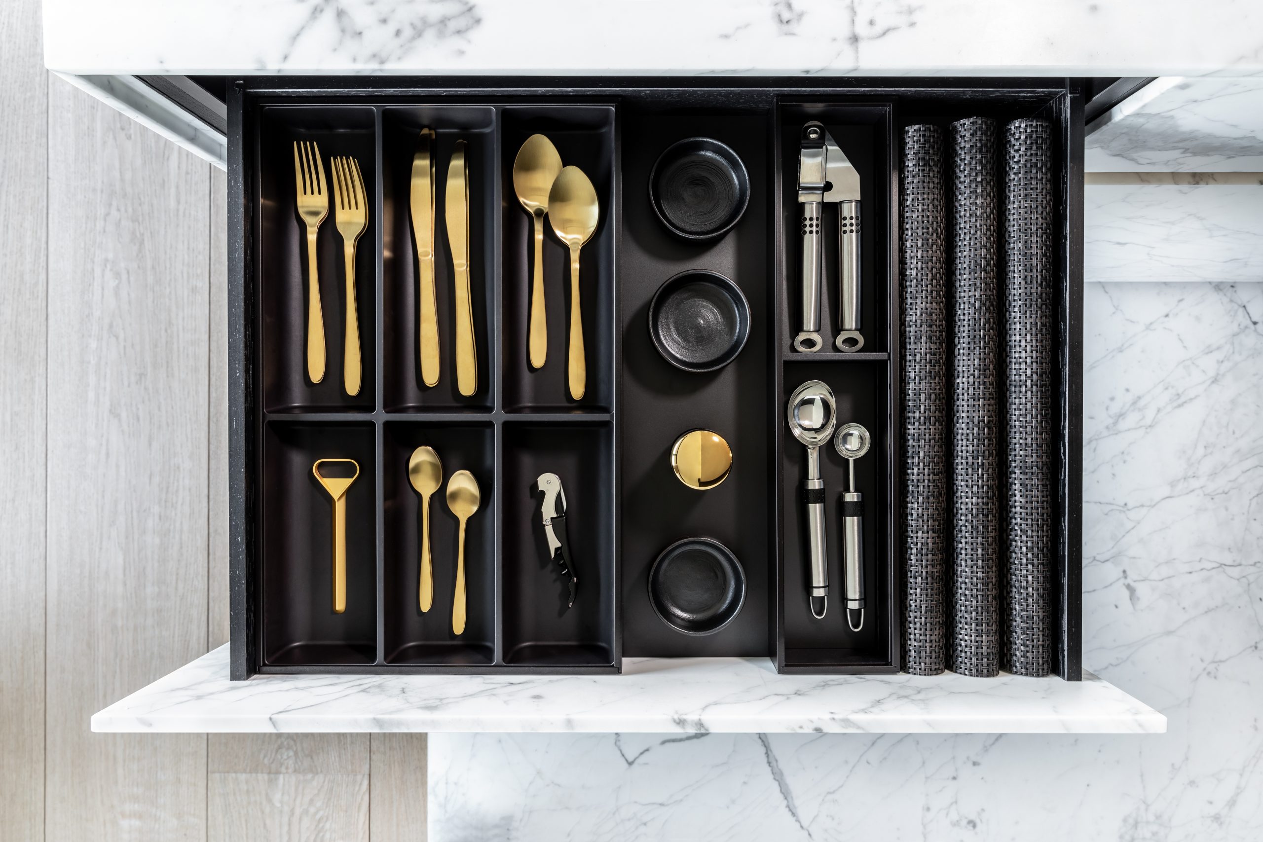 "Kortom: mijn keuken is sinds de doortocht van Danielle van Orgalux tien keer beter georganiseerd. Elke tool heeft een slimme plek gekregen. Ik vind al m’n spullen meteen terug. En het is alsof ik plots veel meer ruimte heb gekregen. En het ziet er ook allemaal chique uit, want de lade-indelingen hebben allemaal dezelfde mooie zwart metalen kleur, zodat ze goed passen bij de zwarte binnenkant van al mijn lades. Als je zelf trouwens voor andere kleuren, of voor een houtlook zou willen gaan, de mogelijkheden zijn echt eindeloos."